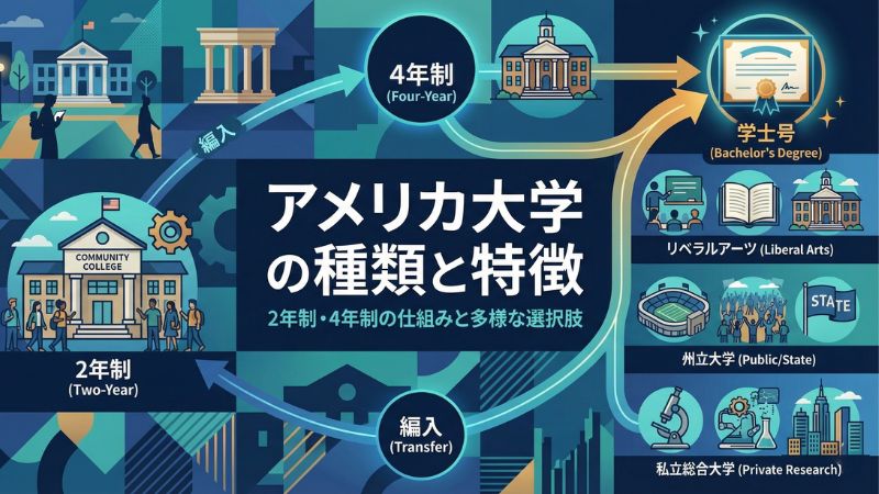 アメリカの大学進学を考える際、最初に理解しなければならないのは「2年制」と「4年制」の関係性が、日本とは全く異なるという点です。